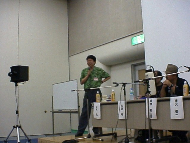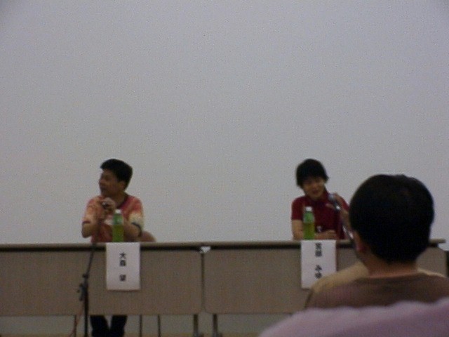 次回の眠田 直さんの企画「デスアニメ 2000年」の時間が迫ってきたので未練を残しつつ退室。何せ御手伝いをしなければならないので時間に遅れるわけにはいかないのだ。喫煙所でしばらく暇を潰し勇んで会場へ。中におられた眠田御夫妻に挨拶する。おお、これがスターウォーズ・エピソード1を見て金髪にし、お子さんに「アタシ、大きくなってもゼッタイ金髪にはしないから」と言わせしめたあの奥さんかと心の中でくすくす。ついでに持参してきていたスタートレック「ヴォイジャー」第4シーズンのテープを渡す。眠田さん、「ホテルで見よう、今夜全部見よう」と嬉しそうに仰ってた。4時間もあるのに本当に好きなんだねえ。その後、獅子児さん、純一郎さん、大会スタッフとともに会場設営の御手伝い。とはいっても機械のセッティングなどはスタッフにお任せしているので我々はもっぱら席の移動やらチラシを置く為の机を設置するだけであった。