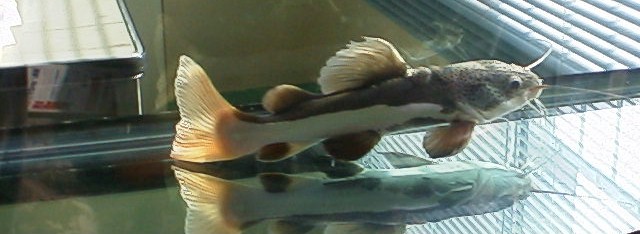 これが現在事務所の水槽で睨みを効かせている南米産の大ナマズ レッドテールキャットであります。性格は一言で言って獰猛そのもの。自分が食えると考えた物は魚だろうがホースの止め金具だろうがなんでも飲み込んでしまいます。ですから我が家のレッド・テールは120センチ水槽での単独飼育。シルバーアロワナなどを同居させている人もいるようですがあまり誉められた事ではないようです。有るマニアなどウン十万したアジアアロワナを一晩で食われてしまったとか。しかも飲みこみきれなかった尻尾が口から出ていてまるでアカンベーをしているように見えたそうです。ちなみにレッドテールのお値段はせいぜい一万円くらい・・・。やっぱり単独飼育が原則ですな。このレッドテールという魚成長期に十分な餌を与えると最終的には1.5メートルもの大きさになります。写真の個体は水温を低めにして成長を押さえていますがそれでも40センチありましてあと2年もすれば150センチ乃至180センチ水槽が必要になるでしょう。この大きささえなければきれいで丈夫、餌の選り好みはしないと理想的なペットフィッシュになるのですが。